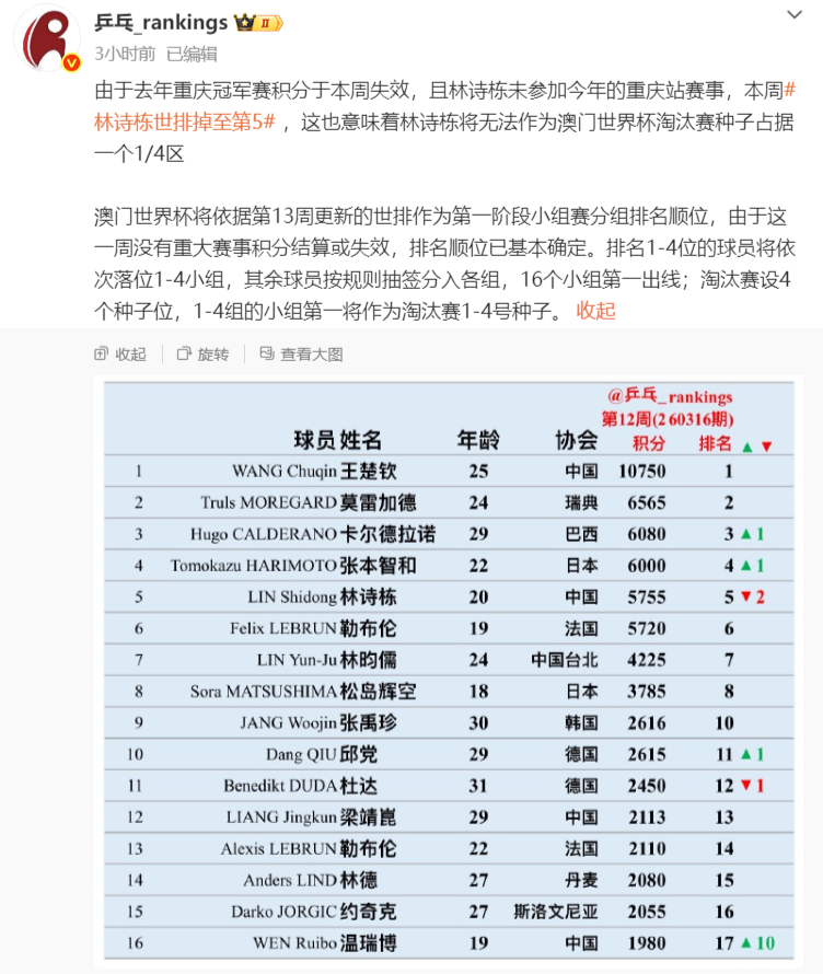 根据乒乓Rankings的报道,由于林诗栋世界排名下滑到第五,他无法作为澳门世界杯淘汰赛种子占据一个1/4区。